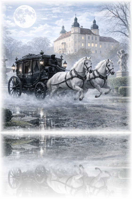 Des Nachts, wenn die Geisterstunde beginnt und ein feiner Nebel sich geheimnisvoll zwischen den alten Bäumen des Schlossparks von Caputh windet, taucht plötzlich eine mysteriöse Kutsche auf. Ihr mattschwarzes Holz glänzt im silbernen Mondlicht, das sich auf den feuchten Pflastersteinen spiegelt. Lautlos gleitet sie eine Stunde lang um das alte Schloss und hinterlässt keine Spur. Im Inneren sitzen Gäste, deren Gesichter bleich und ausdruckslos sind. Ihre Augen wirken leer und verloren, als hätten sie alles Menschliche abgestreift. Starr und unbeweglich verharren sie auf ihren Plätzen, während draußen die Pferde ohne Vorderfüße und ohne Köpfe gespenstisch voranschreiten. Mit dem Glockenschlag eins, als der Nebel sich wieder verdichtet, löst sich die rätselhafte Kutsche wie ein Schatten in der Dunkelheit auf und verschwindet spurlos.